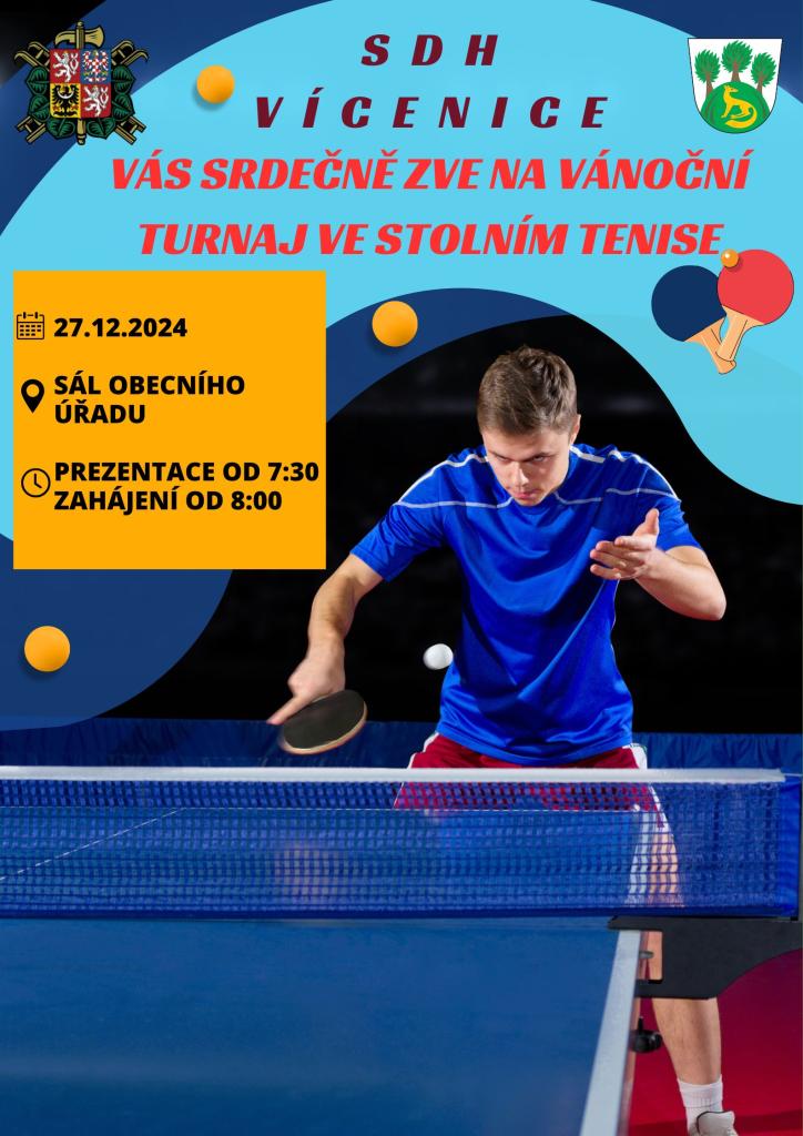 27.12.2024 pořádá SDH Vícenice v sále OÚ tradiční Vánoční turnaj ve stolním tenise. Prezentace hráčů od 7:30 hod., zahájení turnaje v 8:00hod.